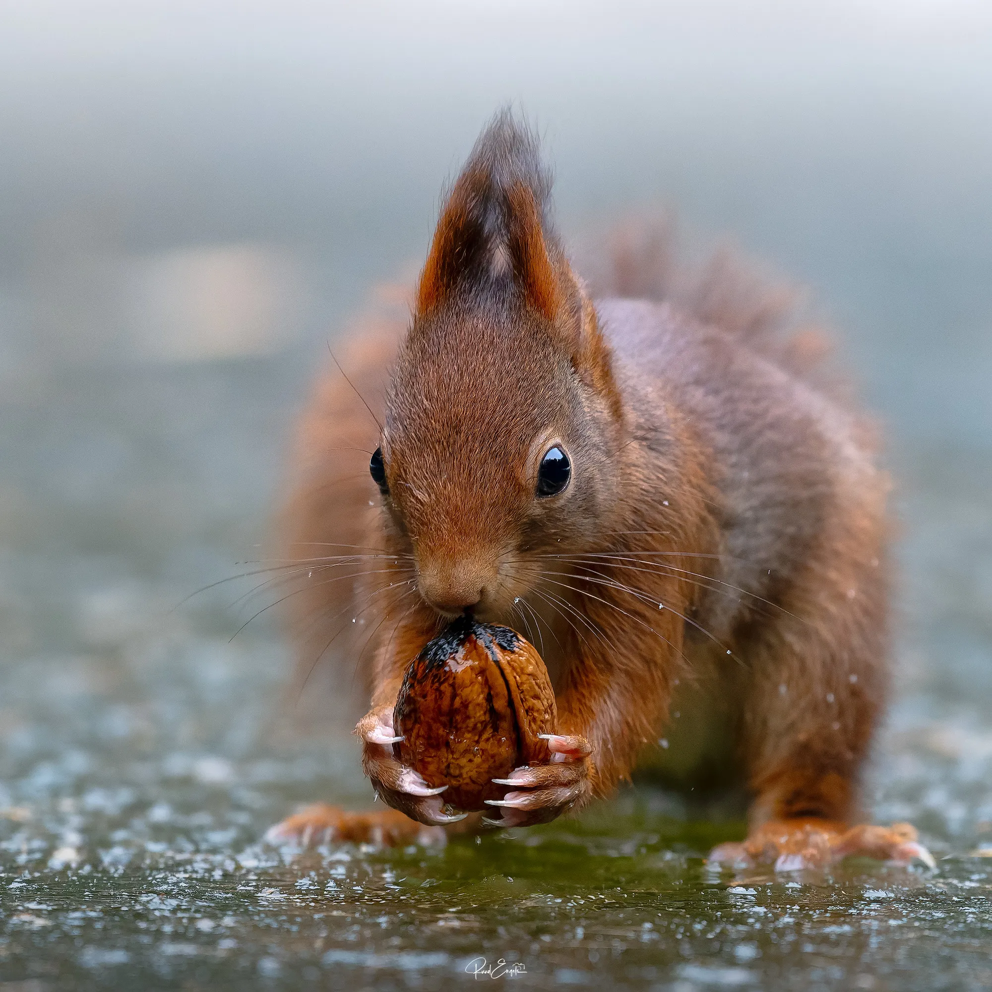 Omdat de vijver bevroren was, besloten we wat walnoten en vogelvoer op het ijs te leggen. Dit in de hoop dat vogels en eekhoorns op een unieke manier voor de camera zouden verschijnen, iets wat je onder normale omstandigheden minder snel ziet. Achteraf bleek dit een uitstekende keuze.